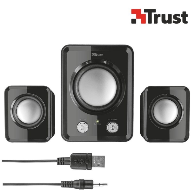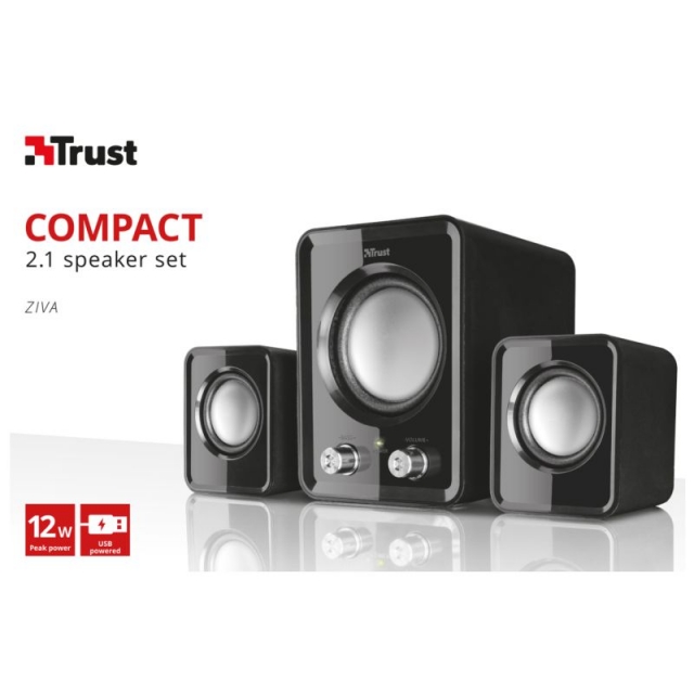 Altavoces 2.1 Trust Ziva 12W Peak, 6W RMS de potencia. Subwofer con control de volumen y bajos. Completo sistema con sonido limpio y de calidad. Diseño moderno y elegante. Respuesta de frecuencia: 100 a 20000 Hz. Alimentado por USB. Ideal para ordenadores portátiles, pcs, tablet o móvil.