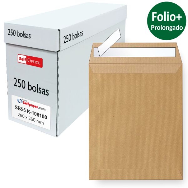 Bolsas 260 x 360 mm color kraft marrónes. Tamaño Folio prolongado, autoadhesivas, 360x260 mm. Papel de calidad de 90 gramos. Caja