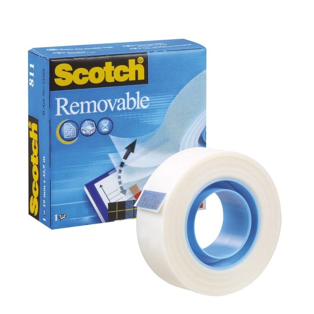 Celo, cinta adhesiva Scotch 811 removible. Se pega y despega con facilidad manteniendo la adherencia y sin dejar marcas en la mayorÃa de superficies. Tamaño 33x19, 19 mm de ancho y 33 metros de longitud. Cinta mate invisible Scotch Magic removible. Para montajes, maquetas, colages.