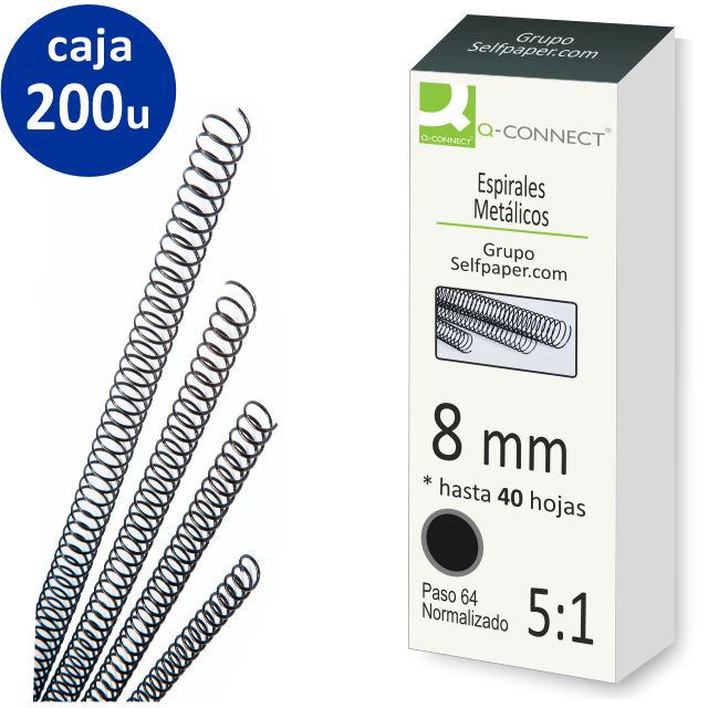 Caja de 200 espirales metálicos para encuadernación, de 8 mm de diámetro. Número 8. Para encuadernar hasta 40 hojas. Paso normalizado 64, 5:1. 59 agujeros por hoja Din A4. Alambre de metal de 1 mm de grosor, lacado en negro. Sustituye ref Fellowes 5110101 ESP08
