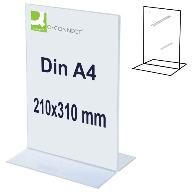Expositor de sobremesa a 2 caras con forma de T invertida. Tamaño Din A4, folio: 210x310 mm. Interior pesonalizable útil: 210x297 mm.