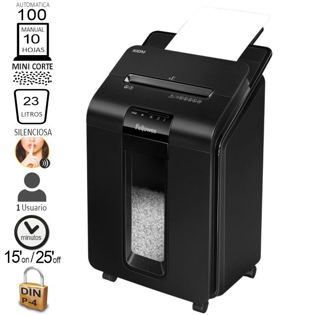 Destructora de papel Fellowes 100M Minicorte, Nivel de seguridad P-4. Corta en partÃculas de 4x10 mm. Alimentación automática 100 hojas. 1 usuario. Para olvidarse de estar introduciendo papeles. Admite grapas, clips y tarjetas de crédito Muy silenciosa. 3 años garantÃa ancho: 390 alto: 670 fondo: 370mm