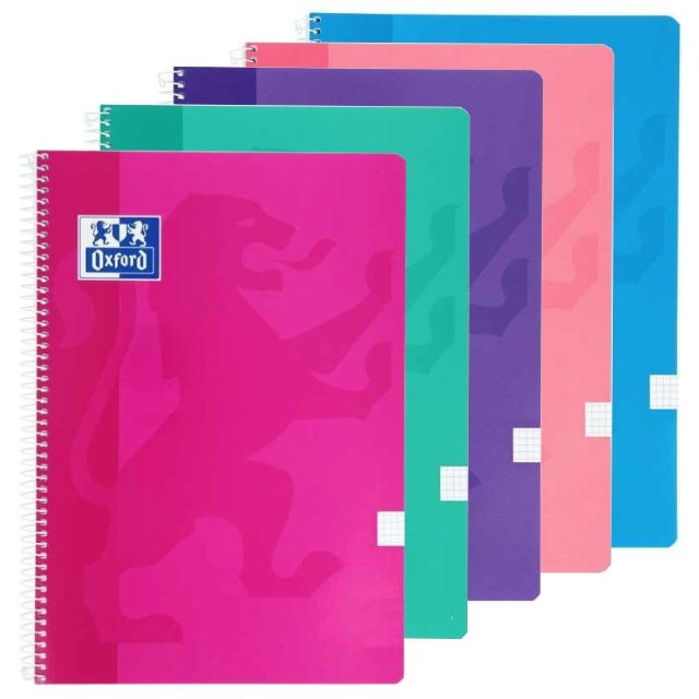 Libretas Oxford tapas blandas, nuevos colores tendencia. Cubiertas de cartoncillo, acabado brillante, plastificado. Papel de 90 gramos, ultra-blanco, de alta calidad. No traspasa la tinta. Tamaño Folio: 225x310mm Cuadriculada, con margen. Cuadros de 4mm. Espiral blanco.