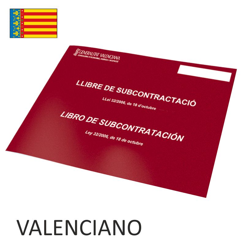 Libro oficial de subcontratación bilingüe Castellano-Valenciano Llibre de subcontractacio Según ley 32/2006 de 18 Octubre Adecuada para empresas de la Comunidad Valenciana. Generalitat Valenciana. Vaálido para Alicante, Valencia y Castellón. 10 hojas numeradas. Duplicado con copia.