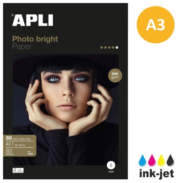 Papel fotográfico profesional para inkjet Din A3, Apli Photobright. Pack de 50 hojas de papel foto glossy con acabado brillante. 200 gramos/m2 de grosor. Conserva las imágenes más tiempo. Secado rápido. Certificado FSC Sostenible. Para impresoras inkjet de cartuchos de todas las marcas.