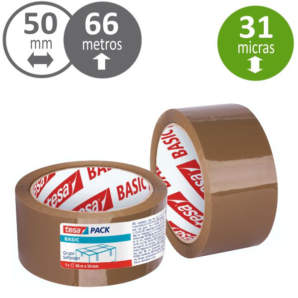 Cinta adhesiva para embalar Tesa Basic de 50 mm de ancho y 66 metros de largo. Precinto de embalaje fabricado con PP, polipropileno de 31 micras de grosor, 41 mic, con adhesivo. Fuerte Pegamento acrÃlico a base de agua, sin disolventes. Calidad Standard, para cierre de cajas de peso medio y bajo.