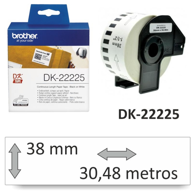 Etiquetas térmicas Brother DK-22225. Rollo de papel continuo de 38 mm de ancho y 30 metros de largo. Apto para la mayorÃa