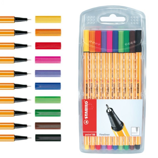 Rotuladores Stabilo Point 88 de 10 colores surtidos. Punta fina, trazo de 0,4mm. Tinta a base de agua. Tonos uniformes, vivos e intensos.