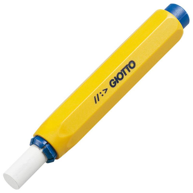 Portatizas de plástico Giotto de llamativos colores surtidos. Porta-tizas con sistema automático retráctil que pulsar el botón abre la puntera que sujeta la tiza. Para tizas redondas estandar de 9 mm de diámetro. Evita mancharse y tocar la tiza. 97 mm de longitud, 18mm diámetro.